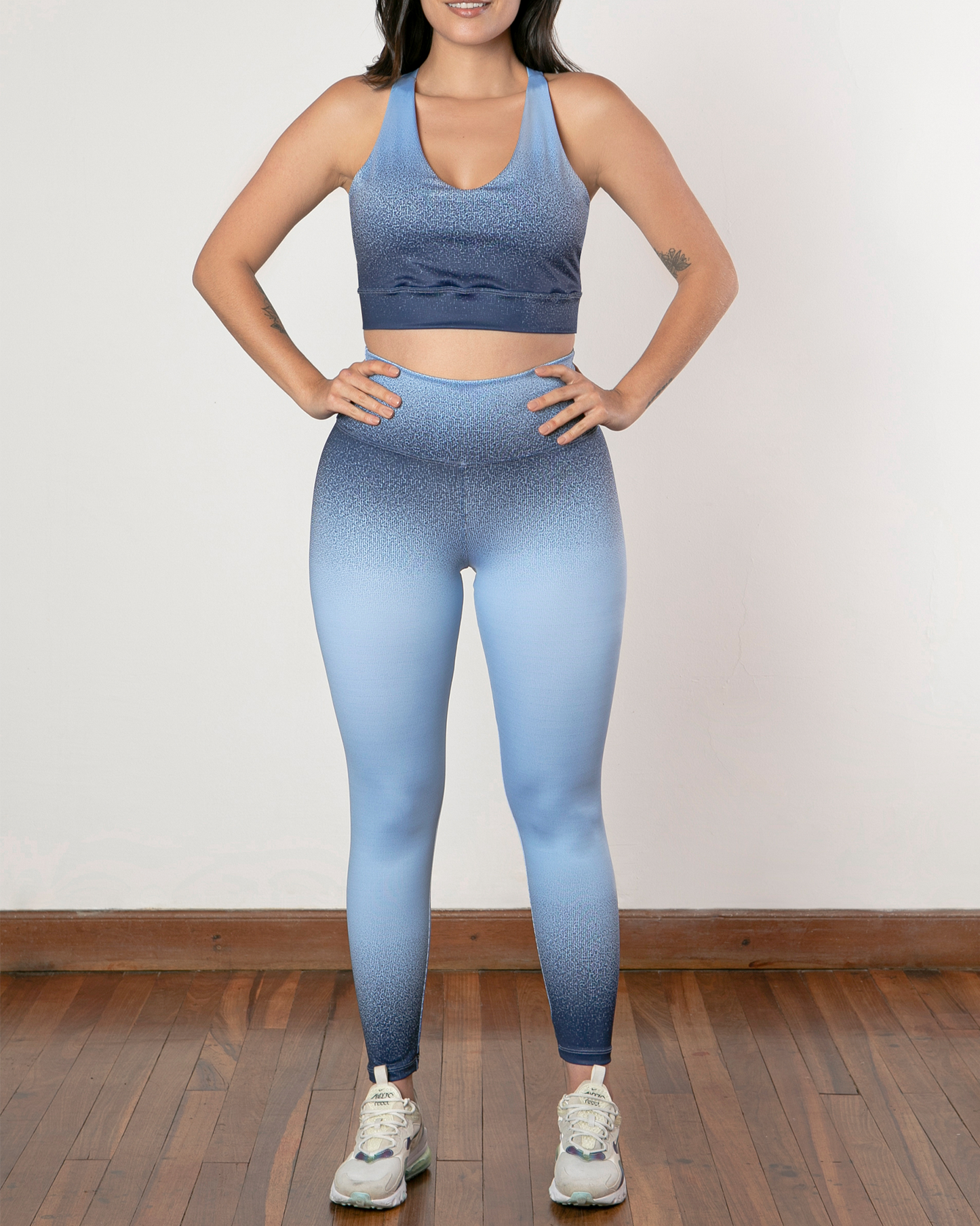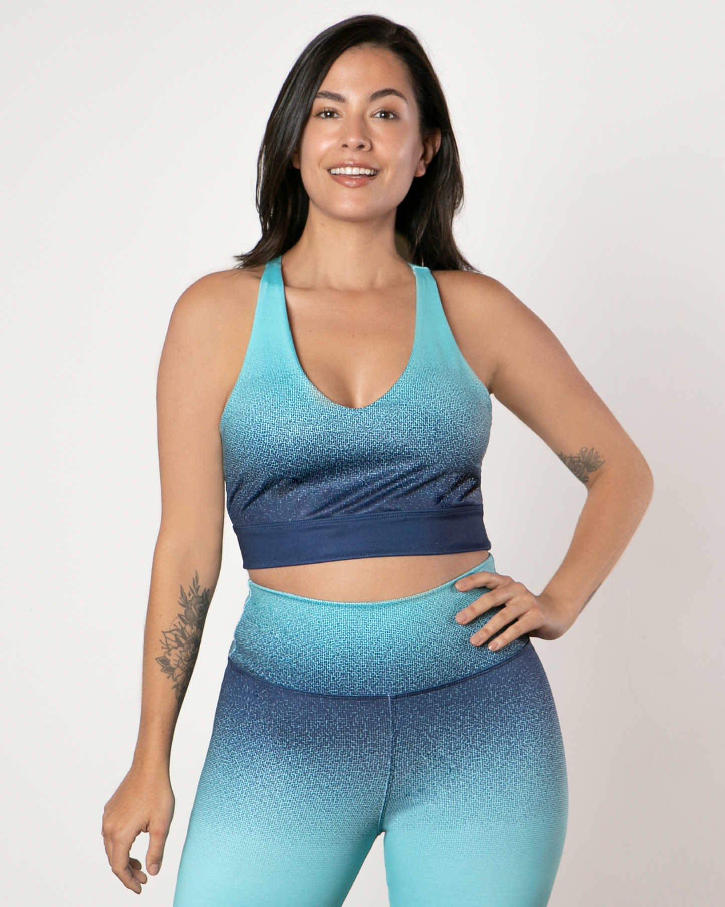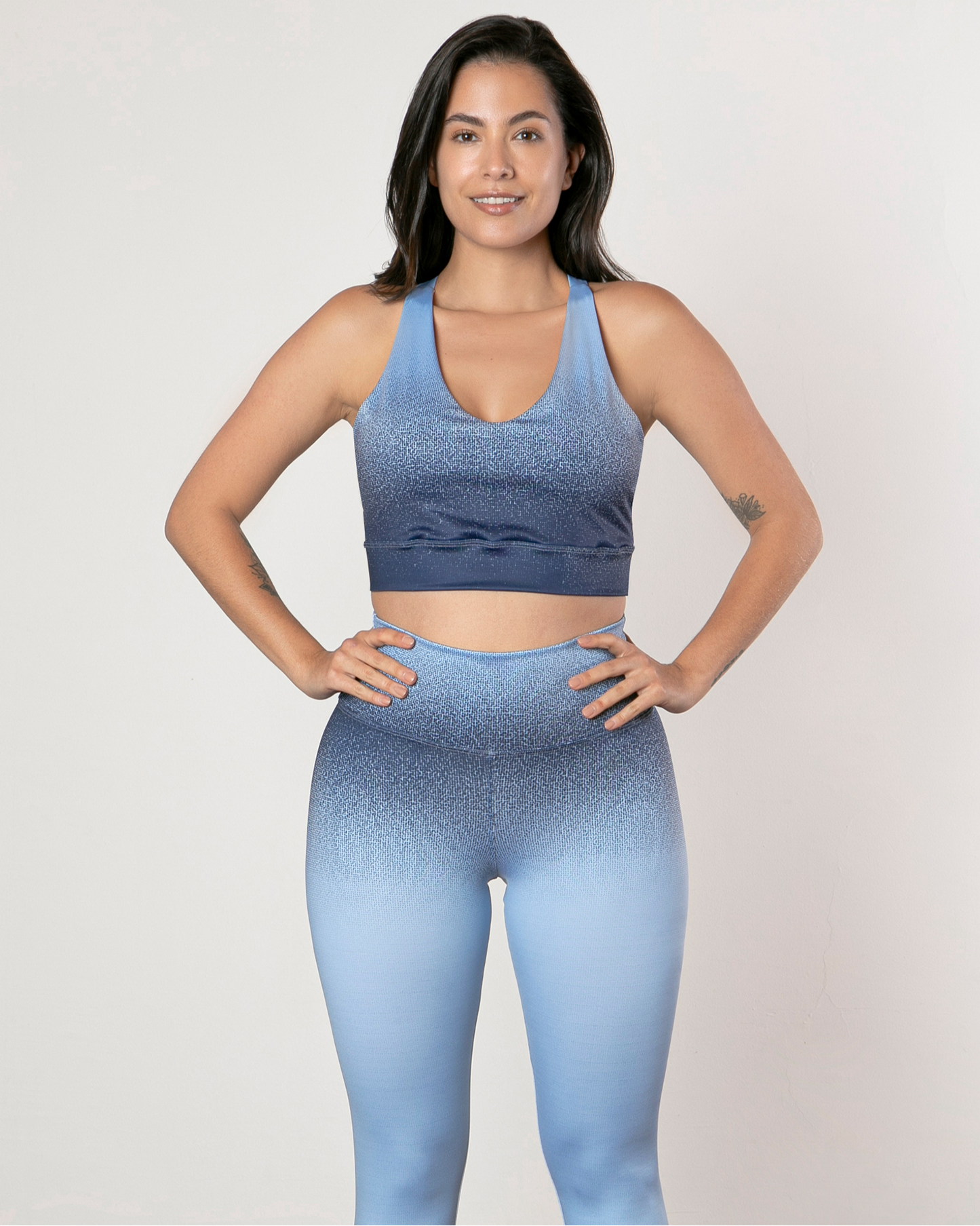 Top deportivo degradé que da soporte y realce al busto. Tiene fajón ancho que ayuda a estilizar el torso. Material de alta compresión de microfibra poliéster con tecnología X-Dry.